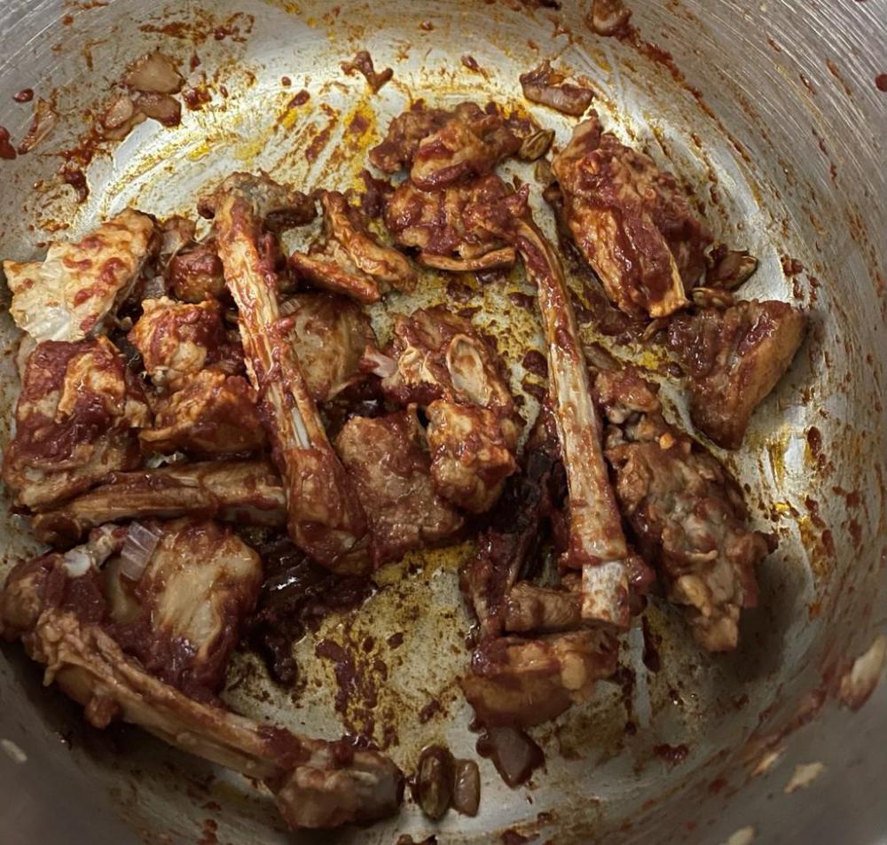 تحمسين بصل في شوية زبدة او سمن مع حبتين هيل وقرفة وبعدها قطع اللحم الافضل يكون بدون عظم