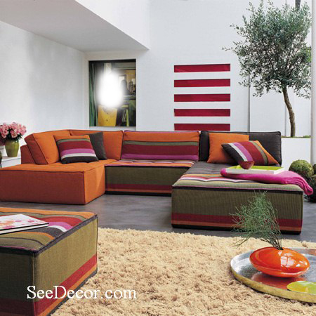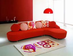 وهنا لون احمر اساسي حار فاقع مع خداديات ابيض واحمر واورانج وقليل فوشيا وسجاده بيضاء لون محايد وتدخل معها نفس الألوان والدهان جدار واحد احمر واتوقع الباقي ابيض... تناغم جميل