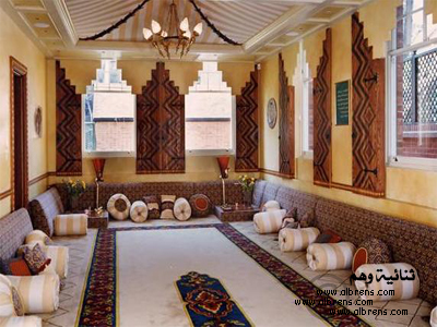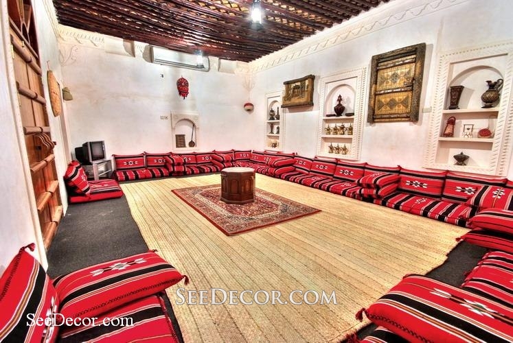 صورة لغرفة مجلس ديكوره من التراث ويشمل على الالوان الترابيه ودرجاته وقطع من النقشات الاسلاميه التراثيه في ديكوور الجدار وقماش الاثاث