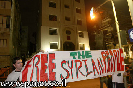نظمت حركة "ام ترتسو" الاسرائيلية تظاهرة تدعو "لإنقاذ الشعب السوري" ، اليوم الاحد ، قبالة السفارة الروسية في مدينة تل أبيب.