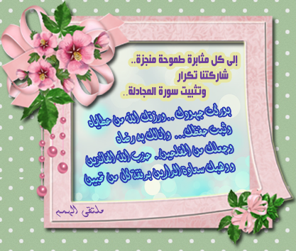 معا كررنا المجادلة.. رددنا الايات بالتراتيل وفي القلب ومع الانفاس.. حتى أسرتنا وذابت في حنايانا.. أسال الله ان يثبت حفظنا لها إلى يوم الدين ويوفقنا لاتقان كتابه وتلاوته على الوجه الذي يرضيه أبارك لكن اخياتي الأجور.. ابارك لكن اوقات مضت في ذكر .. ابارك لكن اجتهاد وتحد وعزيمة.. أبارك لكن بركة القران وعطايا الرحمن لكل من شاركتنا في رحلة التكرار الف الف الف مبروووووووك وابارك لك يا اية انجازك المبهج.. آية_س انت فراشة الاسبوع في تكرار سورة المجادلة.. مبارك 30 تكرار مغلف بالعزم و الإصرار.. مبارك لك الانجاز و التألق و النجاح.. عدت إلينا و كان العود احمد.. عدتِ لتفرحي قلوبنا و تشحني طاقاتنا وتشجعينا وتزيدي عزمنا.. عدتِ لتنافسي وتنجحي وتحلقي تماما كما عهدتك دوما.. فراشة وكما شعرت بك ووصفتك في مقابلتنا معك.. فراشة لونت الملتقى بإجابية وتفاعل بناء وهمة عالية ماشاء الله لا قوة إلا بالله.. مبرووووك وأشكر مساعدتي الخفية الجميلة التي تأتيني دوما مع عصاها السحرية.. لتفاجأنا وتفرحنا بهداياها الثمينة.. شكرا على هذه البطاقة المبهجة.. ام حسن.. ذات الذوق الراق و الفن المميز شكرا لوقتك ولجميل قلبك أسعدك المولى ورزقك من عطاياه وسر خاطرك بما تريدين.. اهدت فانتقت فأبدعت فاسرت القلوب.. لله درك يا ام حسن وعلى شرفكن اهديكن هذا الاحتفال البسيط..معا كررنا المجادلة.. رددنا الايات بالتراتيل وفي القلب ومع الانفاس.. حتى أسرتنا وذابت في...