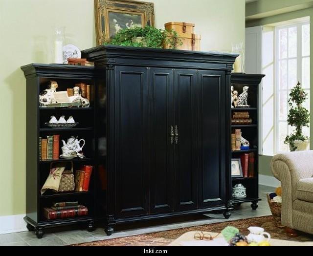 وهنا مكتبة باللون الاسود تقف امام حائط فاتح اللون اظهر جمالها وجمال الجلسة الشاعرية الهادئة كما نرى
