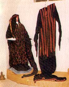 ب- زي رجالي مؤلف من قمباز كحلي مائل إلى السكني وغطاء رأس مؤلف من طاقية لباد بيضاء «لبدة» وطربوش لباد أحمر مع لفة من الحرير البرتقالي والأحمر، وحزام قطني ملون ومطوي بالورب، تستعمله النساء أيضاً. وعباءة من الصوف البني السادة يزينها شريط من القصب حول الرقبة وفتحة الصدر. (أواخر الثلاثينات)