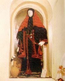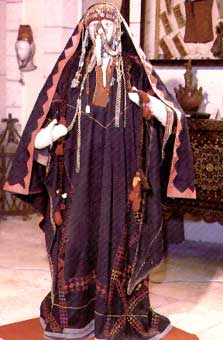 غطاء الرأس: وقاية من الحرير المخطط أحمر وأصفر، مزينة ببعض القطع النقدية ومغطاة بخرقة من القطن الأسود «قنة» مزينة بترقيع أحمر حول أطرافها الأربعة «مشرف» (أوائل القرن العشرين)