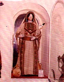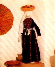 الزيٌ الشعبي الفلسطيني زي لعروس مقدسية (1870) طراز تركي مؤلف من تنورة وجاكيت من المخمل الليلكي المطرز بالقصب على النمط التركي، مع بلوزة من الحرير البيج. يظهر هذا الزي التأثير التركي على الأزياء الفلسطينية إبان حكم الدولة العثمانية. زي أفراح لفتا ودير ياسين وسلوان وأبو ديس وقرى أخرى في قضاء القدس. الثوب عرف باسم (ثوب غباني) نسبة للقماش الغباني المستورد من حمص وحلب (سوريا) وتطريزه على نمط بيت لحم «بقطبة التحريرة».(أوائل الأربعينات) زي نسائي للأفراح في رام الله وقضائها.. يتميز بجماله وغزارة التطريز وبالرسمات التقليدية الأصيلة في الثوب والخرقة كوحدة (نخلة علي) الشهيرة مع بعض الرسومات الأوروبية الدخيلة منذ أواخر القرن التاسع عشر، كالأزهار، وتزيده جمالاً الوقاية أو الصفة المزدانة بالقطع النقدية الفضية والذهبية (عثملي) التي تكون قسطاً من مهر العروس ومدخراتها. وتعرف صفة المرأة المتزوجة «بالصمادة». (أواخر العشرينات) زي أريحا ومنطقة البحر الميت، ثوب تقليدي طويل جداً وفضفاض يثنى عند الخصر ليتدلى على طاقين بواسطة حزام حتى يصل الأرض أو أقل قليلاً. أكمامه أو أردانه متناهية الطول والسعة، دقيقة الأطراف، وقد شبهها البعض بالأجنحة. استعملت إحداهما كغطاء للرأس وربطت بعصبة من الحرير الملون. التطريز يختلف عن الفلاحي ويظهر كخطوط ملونة عمودية ومتعرجة تغطي القسم الأمامي والأكمام. والزي يشاهد حتى اليوم خاصة على عجائز المنطقة.(أواخر العشرينات) ثوب أريحا: حديث من الحرير الأسود الستان طويل جداً حوالي 5 أذرع وفضفاض يلبس بنفس الطريقة كالتقليدي لكن تطريزه يختلف ومعظمه باللون الأحمر والقطبة الفلاحي على شكل أقلام عريضة من الأزهار وأردانه أقل طولاً وعرضاً. زي نسائي حديث من قضاء القدس: ثوب مخملي أسود يشاهد مثله حتى اليوم. تطريزه يدوي بطريقة اللف ومعظم رسوماته أزهار متعددة الألوان. (قروية تحمل جونة خضار قديمة 1936 على رأسها لتبيعها في السوق). زي تقليدي لبدويات منطقة بحيرة الحولة مؤلف من ثوب قطني أسود مزين بخطوط عريضة من التطريز الأبيض حول الأطراف، وجاكيت من الجوخ الكحلي مزين بأشرطة وتطريز باللون الأحمر. يتميز الزي بغطاء رأس من الحرير الأحمر الملون والمبطن بقماش قطني أسود. يلبس مقفل من الأمام وأحياناً مع عصبة.(أواخر العشرينات)الزيٌ الشعبي الفلسطيني زي لعروس مقدسية (1870) طراز تركي مؤلف من تنورة وجاكيت من المخمل...