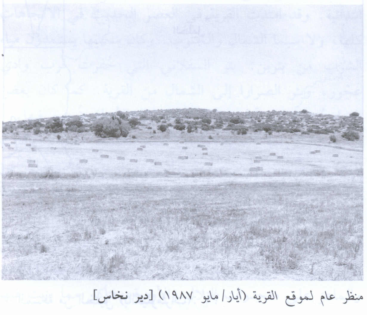 ديْر نْخّاس المسافة من الخليل (بالكيلومترات): 20 متوسط الارتفاع (بالأمتار): 325 ملكية الأرض واستخدامها في 1944/1945 (بالدونمات): الملكية الاستخدام: عربية: 8923 مزروعة: 5249 يهودية: 0 (% من المجموع): (36) مشاع: 5553 مبنية: 22 ـــــــــــــــ المجموع: 14476 عدد السكان: 1931: 451 1944/1945: 600 عدد المنازل (1931): 86 دير نخاس قبل سنة 1948 كانت القرية مبنية على قمة تل تمتد تحته طبقة كلسية قاسية، ومشرقةَ على وادي بيت جبرين من الجهة الشمالية. وكانت تقع في الجهة الجنوبية من طريق الخليل-بيت جبرين- المجدل العام، وتصلها عدة طرق فرعية بالقرى المجاورة. ومن الجائز أن يكون القسم الثاني من اسمها مشتقاً من كلمة ساميّة عامة تعني النحاس. في سنة 1596، كانت دير نخاس قرية في ناحية الخليل (لواء القدس)، وعدد سكانها 72 نسمة. وكانت تؤدي الضرائب على عدد من الغلال كالقمح والشعير والزيتون، بالإضافة إلى عناصر أُخرى من الإنتاج كالماعز وخلايا النحل. في أواخر القرن التاسع عشر، كانت دير نخاس قرية صغيرة جاثمة على تل شاهق، ومشرفة على وادٍ من جهة الشمال. وكانت تمتد بشكلها المستطيل في موازاة الطريق المؤدية إلى الخليل. وكان سكانها، وهم من المسلمين، يبنون منازلهم بالحجارة، ويرسلون أولادهم إلى مدارس القرى المتاخمة. وكانوا يعتاشون من الزراعة وتربية المواشي، وينتجون أنواعاً عدة من الغلال، ولا سيما القمح والعنب والزيتون. في 1944/1945، كان ما مجموعه 4887 دونماً مخصصاً للحبوب، و362 دونماً مروياً أو مستخدماً للبساتين. وكان ينبت في الوعر المحيط بالقرية الغابات والأجمات والأعشاب البرية، وكانوا يستخدمون تلك المساحات مرعى للأغنام والماعز. كما كانت دير نخاس تقع في منطقة غنية بالمواقع الأثرية؛ إذ كان ثمة في مساحة الخمسة عشر ألف دونم تقريباً، التابعة للقرية، نحو 15 موقعاً – من جملتها القرية نفسها (التي كانت بُنيت فوق موقع أثري). احتلالها وتهجير سكانها احتُلّت القرية وقت احتلال بيت جبرين، في المرحلة الثالثة من عملية يوآف. فبعد أن أُنجز معظم العملية تابع بعض الواحدات الإسرائيلية تقدمه شرقاً في منطقة الخليل، فاحتل دير نخاس في 29 تشرين الأول/أكتوبر 1948. وفي اليوم نفسه، ارتكب الإسرائيليون مجزرة في قرية الدوايمة المجاورة. ويذهب المؤرخ الإسرائيلي بين موريس إلى أن المجزرة عجّلت نزوح السكان الكثيف عن المنطقة المحيطة بقرية دير نخّاس. المستعمرات الإسرائيلية على أراضي القرية لا مستعمرات إسرائيلية على أراضي القرية. أما مستعمرة نحوشا، التي أُسست في سنة 1982 على أراضي خربة أم برج، فتقع على بعد نحو 3 كلم بخط مستقيم نحو الغرب. القرية اليوم لم يبق من القرية إلاّ بضعة منازل مهجورة، وأنقاض منازل أُخرى. أحد المنازل المهجورة مبني بالأسمنت، وله نوافذ مستطيلة وسقف مسطح، وهو معلّم بكتابات عربية وقائم وسط الحشائش والأعشاب البرية الطويلة. وثمة كثف مسيّج. أمّا الأراضي المحيطة فيستغلها المزارعون الإسرائيليون.ديْر نْخّاس المسافة من الخليل (بالكيلومترات): 20 متوسط الارتفاع (بالأمتار): 325 ملكية...