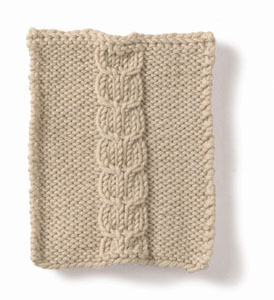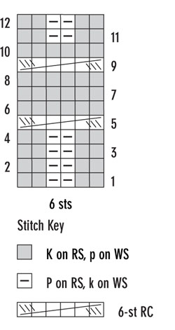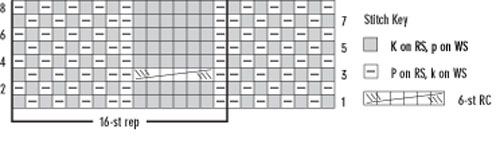 Note: the instructions below are a generic description of how to execute this stitch pattern. For a single repeat, you'd only need eight stitches (6 + 2) but you'd have a VERY narrow piece! In the example shown, there are four repeats of the stitch, so to make a swatch that looks like the one shown, you need to cast on 26 stitches (4 x the multiple of 6 plus 2 extra stitches.)