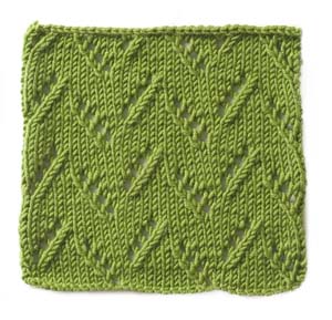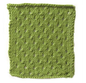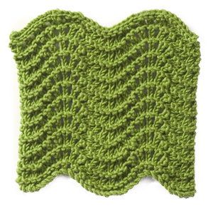 Note: the instructions are a generic pattern for creating this stitch pattern. For a single repeat, you'd only need two stitches (but you'd have a VERY narrow piece!) In the example shown, there are eighteen repeats of the stitch, so to make a swatch that looked the same, you need to cast on 36 stitches (16 x the 2 multiple.)