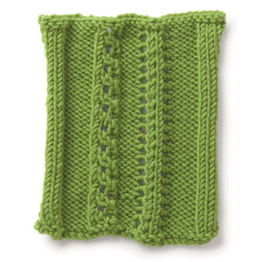 Note: the instructions below are a generic description of how to execute this stitch pattern. For a single repeat, you'd only need nine stitches (8 + 1) but you'd have a VERY narrow piece! In the example shown, there are four repeats of the stitch, so to make a swatch that looks like the one shown, you need to cast on 33 stitches (4 x the multiple of 8 plus 1 extra stitch.)