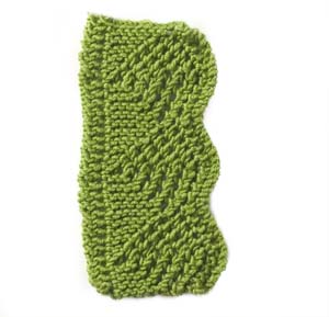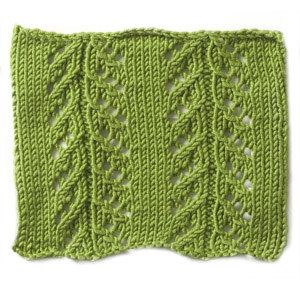 Note: the instructions below are a generic description of how to execute this stitch pattern. For a single repeat, you'd only need eleven stitches but you'd have a VERY narrow piece! In the example shown, there are three repeats of the stitch, so to make a swatch that looks like the one shown, you need to cast on 33 stitches (3 x the multiple of 11 stitches needed for a single repeat of the pattern.)