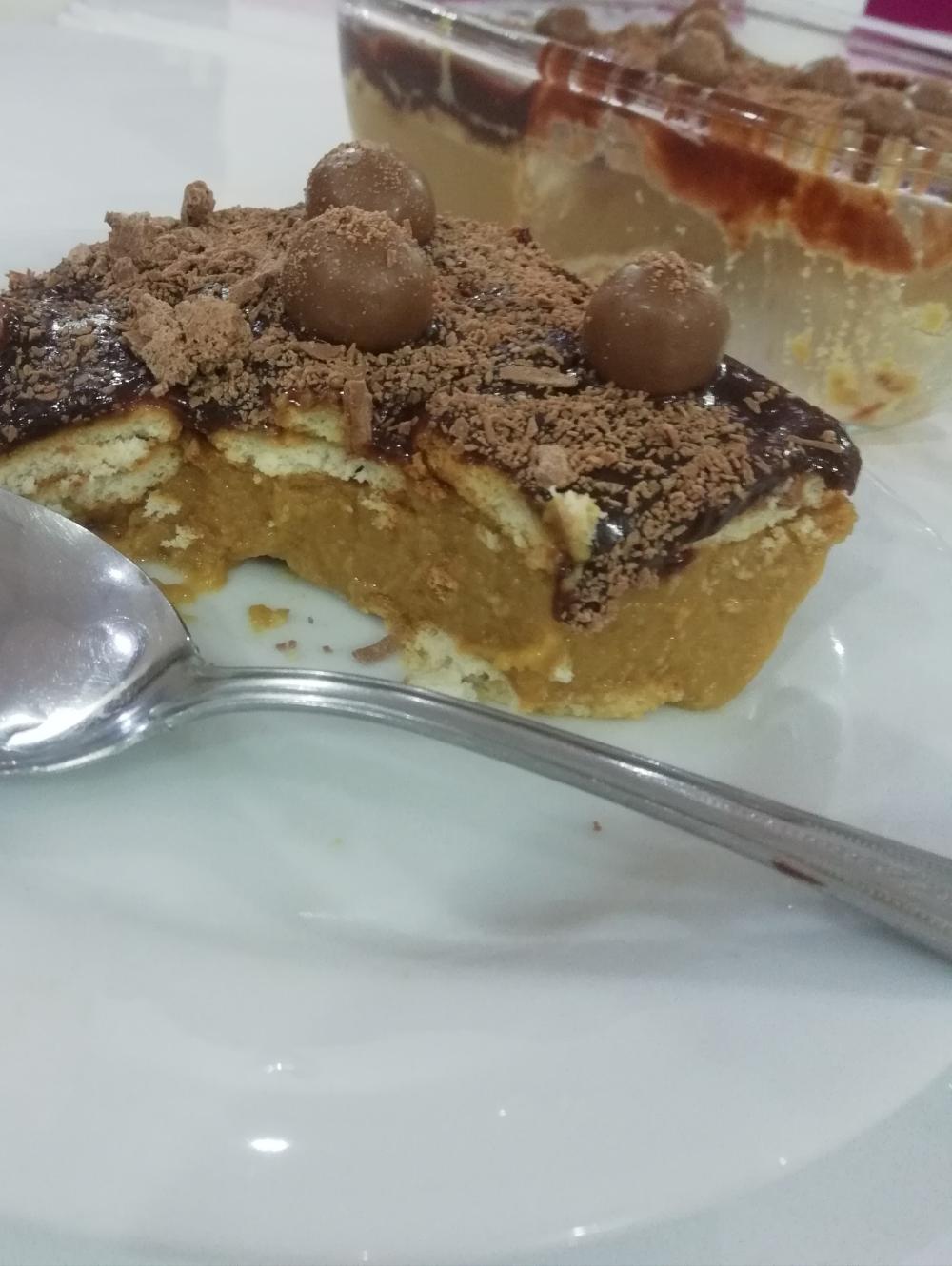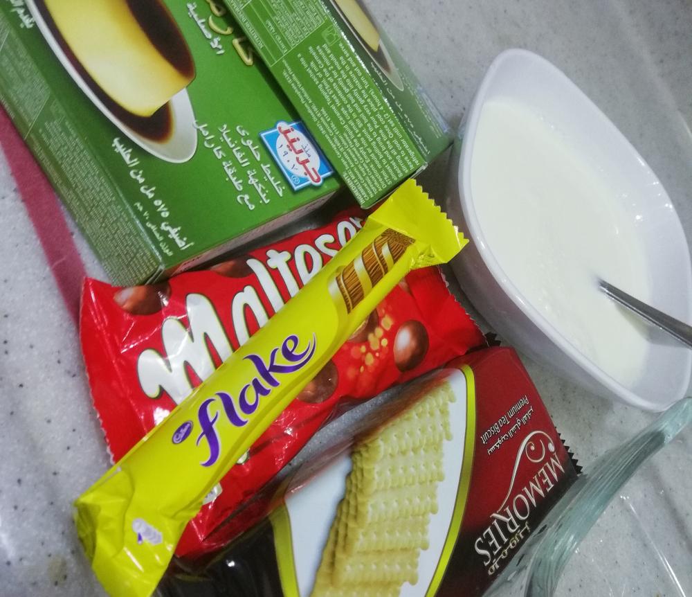 الطبقة الاولى بسكويت شاي مغمس بحليب سوي كم طبقة براحتك اهم شيء فوق طبقتين الطبقة الثانية (ظرفين كريم كراميل +ملعقتين قشطة +كاسين حليب على النار الين تفور خذي خلاط الكااااس تمام حطي فية الخليط وعليهم 7حبات بسكويت شاي 4اصابع جالكسي اي نوع تفضلينه وملعقة صغيرة جدا نسكافيه واضربيهم