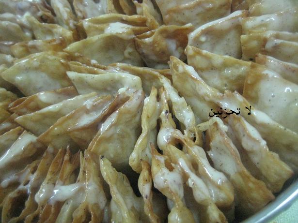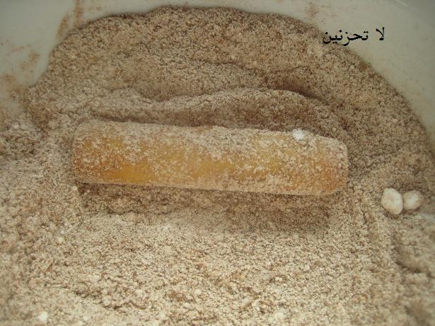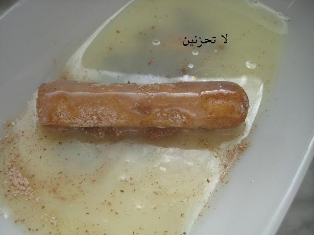 نغطسها بخليط السكر البودر والقرفة ثم خليط الشيرا والحليب المركز (نصف علبة حليب محلى مع نصف كاس شيرا)