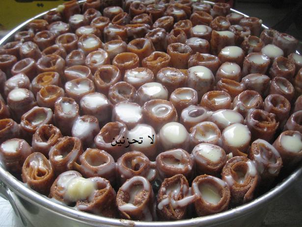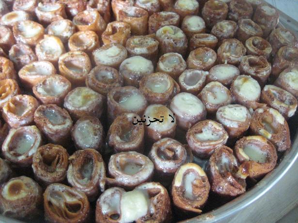 نخلط نصف كاس شيرا مع نصف علبة الحليب المحلى المركز في وعاء ونغطسهم فيها