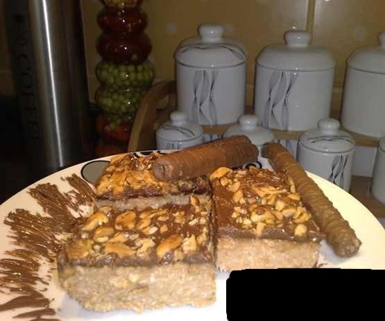 كلهاا عليها ونغطيها كامله بهذا الشكل نجهز فول سوداني مجروش ونحطه على الشوكلاته نغطيها كامله با الفول سوداني ونظغط عليه با الملعقه شوي شوي بس من فوق على شان يثبت الفول با الشوكلاته