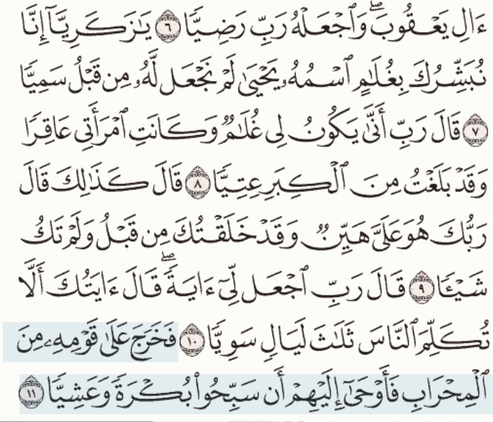 فَخَرَجَ عَلَى قَوْمِهِ مِنْ الْمِحْرَابِ فَأَوْحَى إِلَيْهِمْ أَنْ سَبِّحُوا بُكْرَةً وَعَشِيّاً (11)