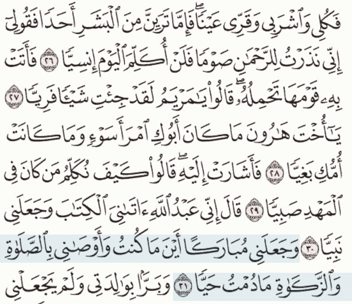 وَجَعَلَنِي مُبَارَكاً أَيْنَ مَا كُنتُ وَأَوْصَانِي بِالصَّلاةِ وَالزَّكَاةِ مَا دُمْتُ حَيّاً (31)