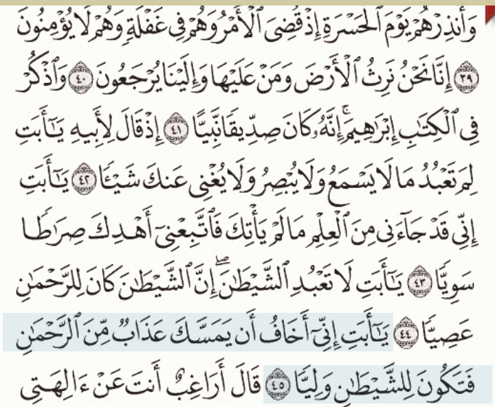 يَا أَبَتِ إِنِّي أَخَافُ أَنْ يَمَسَّكَ عَذَابٌ مِنْ الرَّحْمَنِ فَتَكُونَ لِلشَّيْطَانِ وَلِيّاً (45)