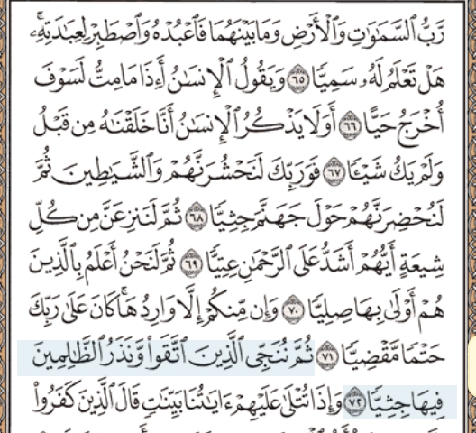 وَإِنْ مِنْكُمْ إِلاَّ وَارِدُهَا كَانَ عَلَى رَبِّكَ حَتْماً مَقْضِيّاً (71) ثُمَّ نُنَجِّي الَّذِينَ اتَّقَوْا وَنَذَرُ الظَّالِمِينَ فِيهَا جِثِيّاً (72)
