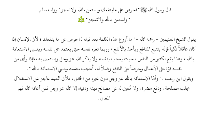 عندما تأخذ بمصحفك لتتلُو .. ضع هدفك قبل التلاوة في المُقدّمة ، أعني على ناصية قلبك ، واسأل نفسك ثم أجب ... بمعنى : - لماذا أقرأ القرآن ؟- لأزداد به إيمانـا ..ستقرؤه -بفتحِ الله وإذنه- بصورةٍ أخرى تمامًا ، صورة غريق يطلب النجاة ، فارغ يطلب الامتلاء ، جاف يريد أن يرتوي