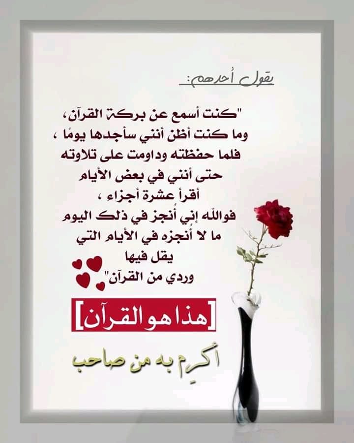 مااا شاء الله مبارك يالغالية اللهم اجعل القرآن ربيع قلبها ونور صدرها وجلاء همها وحزنها اللهم اجعله حجة لها لاعليها شفيعا يوم القيامة اللهم ارزقها بكل حرف تقرؤه حلاوة في التلاوة وانشراحا وأنسا في الصدر الله اجعلها من يقرؤه فيرقى لا ممن يقرؤه فيشقى اللهم علمها منه ماجهلته وذكرها منه مانسيته واجعل درجتها في علييينمااا شاء الله مبارك يالغالية اللهم اجعل القرآن ربيع قلبها ونور صدرها وجلاء همها...