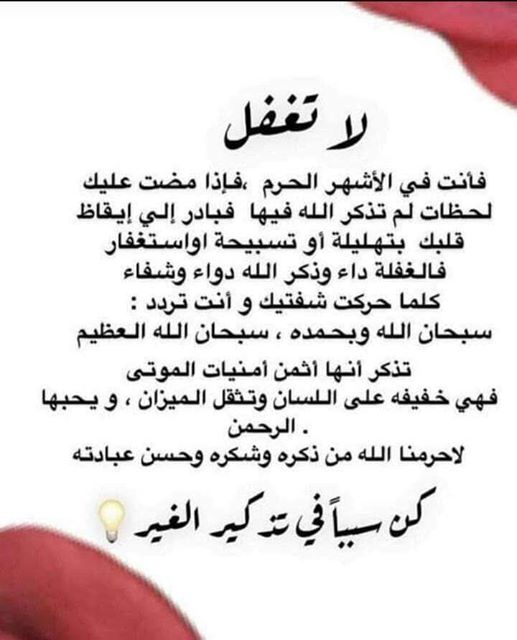 قال الغزالي: ( إن الله إذا أحب عبداً استعمله في الأوقات الفاضلة بفواضل الأعمال. وإذا مقته استعمله في الأوقات الفاضلة بسيء الأعمال ليكون ذلك أوجع في عقابه). ............. كُنْ شديد اللهج بـ( اللهم استعملني في طاعتك)، وأمثاله خاصة في الأيام الفاضلة اللهُ أكبرُ ، اللهُ أكبرُ ، لاَ إلَهَ إلَّا الله .واللهُ أكبر ، اللهُ أكبر ، ولله الحَمد) .الله أكبر كبيرًا ، والحمد لله كثيرا ، وسبحان الله بكرة وأصيلا .قال الغزالي: ( إن الله إذا أحب عبداً استعمله في الأوقات الفاضلة بفواضل الأعمال. وإذا مقته استعمله...