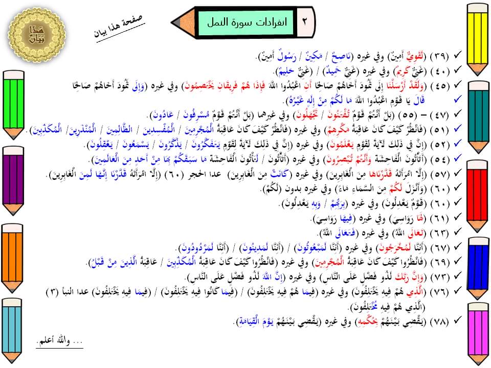 اختبار في سورة النمل اكملى ما يلي قال تعالى وَصَدَّهَا..............................يَعْدِلُونَاختبار في سورة النمل اكملى ما يلي قال تعالى ...