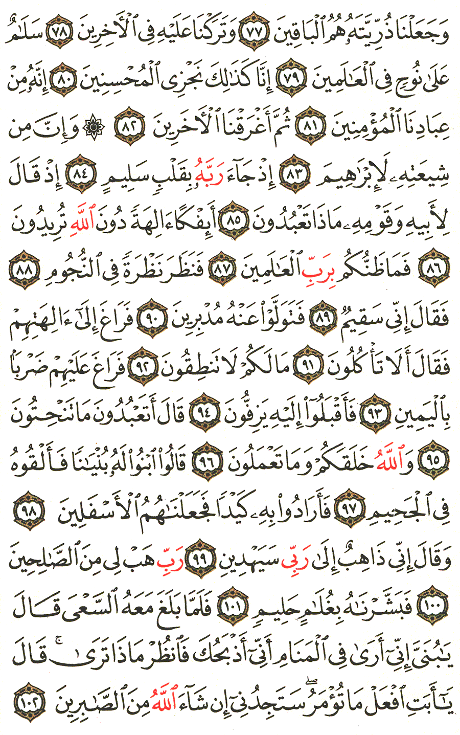 102 - فلما شب إسماعيل، وأدرك سعيُه سعي أبيه رأى أبوه إبراهيم رؤيا، ورؤيا الأنبياء وحي، قال إبراهيم مخبرًا ابنه عن فحوى هذه الرؤيا: يا بني، إني رأيت في النوم أني أذبحك، فانظر ما ترى في ذلك، فأجاب إسماعيل أباه قائلًا: يا أبي، افعل ما أمرك الله به من ذبحي، ستجدني من الصابرين الراضين بحكم الله.
