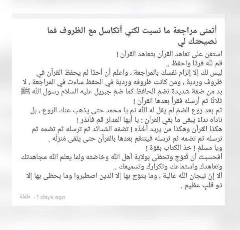 عليكم السلام ورحمة الله وبركاته ياهلا بفيض المثابرة ..ماشاء الله عليك تبارك الرحمن ... الله يثبت حفظك ويرزقك الختمة... ربي ارزقها راحة تنبع من أعماقها بقدر رحمتك ولطفك، وانفث في صدرها الانشراح، واكتب لها السعادة والرضى وأنر دروبها ولاتجعل لأحد من عبادك عليها سبيل ويسر عليها كل عسير ووفقها وسخر لها عبادك وارزقها قلبا بحبك عامرا من الهموم خاليا وبالهنا فائضا اللهم ارزقها من حيث تحتسب و حيث لا تحتسب و اصلح أمورها ولا ترد لها دعاء و لا تسكن فيها داءعليكم السلام ورحمة الله وبركاته ياهلا بفيض المثابرة ..ماشاء الله عليك تبارك الرحمن ... الله يثبت...