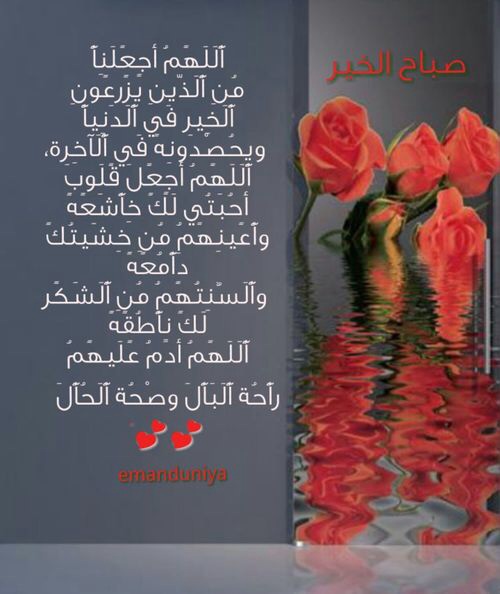 اللهم كما أنرت الكون بنورالصباح أنر حياتها بنورالهدايه،، اللهم أجعل ايامها خالية من الهمومَ اللهم اغنها "بالعلم" وأكرمها "بالتقوى " وجمّلها "بالعافية" اللهم اشغلها بما خلقتها له ولا تشغلها بماخلقته لها اللهم إني أسألك لها بركة تطهر بها قلبها وتكشف بها كربها ، وتغفر بها ذنبها ، وتصلح بها امرها وتكشف بها همها وغمها، وتشفي بها سقمها ، وتقضي بها دينها، وتجلو بها حزنها ، وتجمع بها شملها وتبيض بها وجهها.اللهم كما أنرت الكون بنورالصباح أنر حياتها بنورالهدايه،، اللهم أجعل ايامها خالية من الهمومَ اللهم...