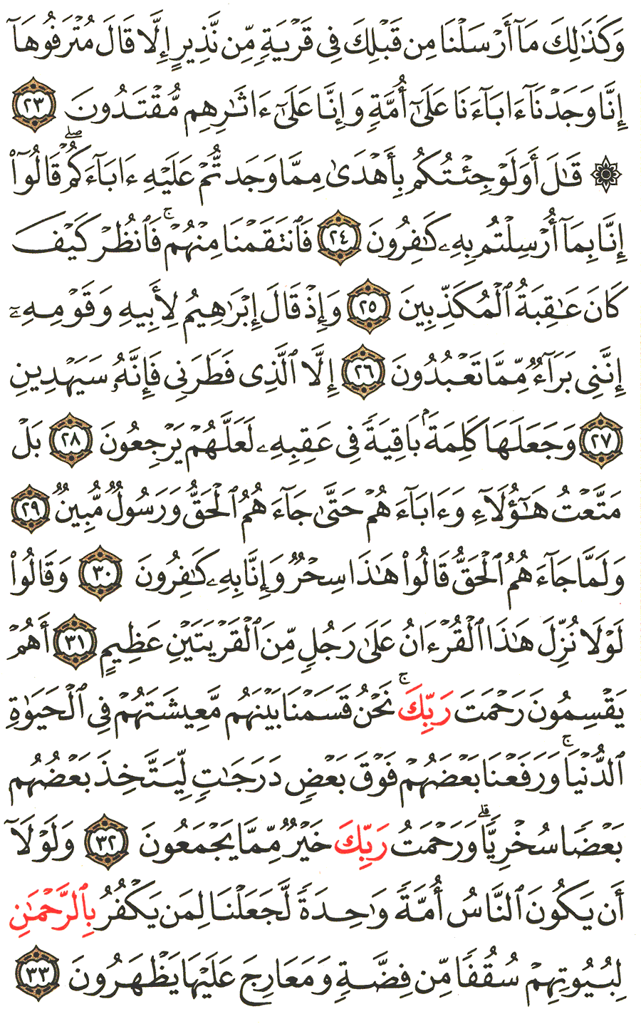 23 - وكما كذَّب هؤلاء، واحتجوا بتقليدهم لآبائهم، لم نبعث من قبلك -أيها الرسول- في قرية من رسول ينذر قومه إلا قال رؤساؤهم وكبراؤهم من أهل الثراء فيهم: إنا وجدنا آباءنا على دين وملة، وإنا متبعون لآثارهم. فليس قومك بدْعًا في ذلك.
