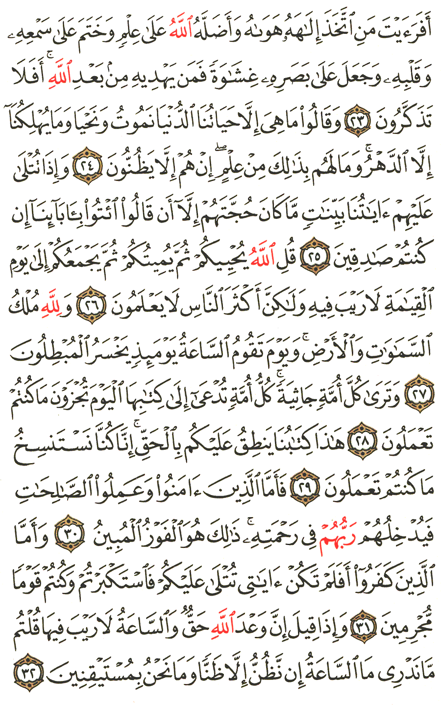 28 - وترى -أيها الرسول- في ذلك اليوم كل أمة باركة على ركبها تنتظر ما يفعل بها، كل أمة تدعى إلى كتاب أعمالها الذي كتبه الحفظة من الملائكة، اليوم تجزون -أيها الناس- ما كنتم تعملون في الدنيا من خير وشرّ.