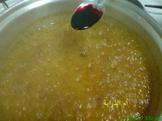 اضيفي الماء الورد ثم الهيل ثم الزيت وكذلك اللون مع الاستمرار بالتحريك على نار عاليه