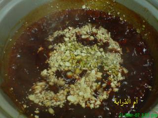 كل 3دقائق يحرك المزيج ستلاحظين انه يتماسك شيئا فشيئا اضيفي المكسرات واتركيها