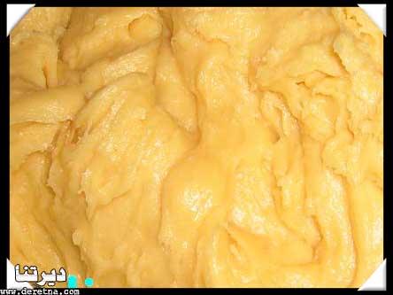 وبعدها نزل قشرته و ننشفه من الماء ويطحن اللوز مع السكرحتى يصبح لينا مثل العجين وبعدها نضيف اليه ماء الزهر والزبدة ونخلط