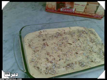 وتوضع طبقه بسكويت عادي او جوزاء وطبقه أخرى من ألخلطه..