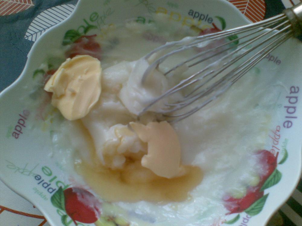 تضاف الزبدة بقطع صغيرة ويتابع الخلط بسرعة
