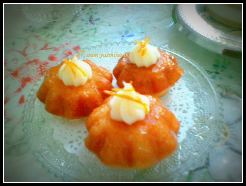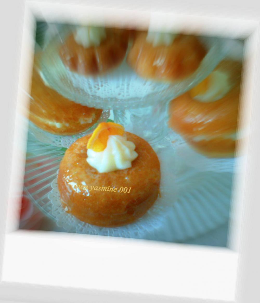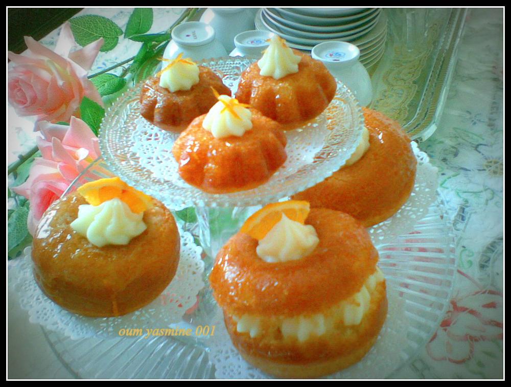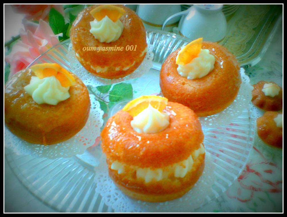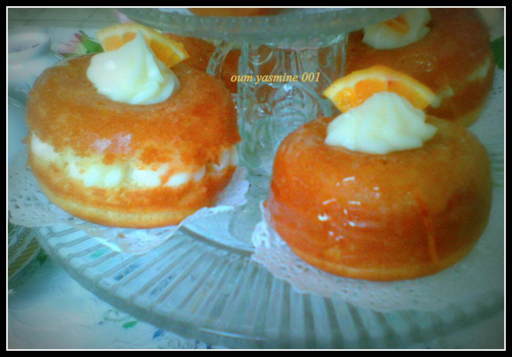 ثمّ نقطع كل قطعة بابا إلى نصفين وتحشى بالكريمة الموسلين و تزين بقطع برتقال