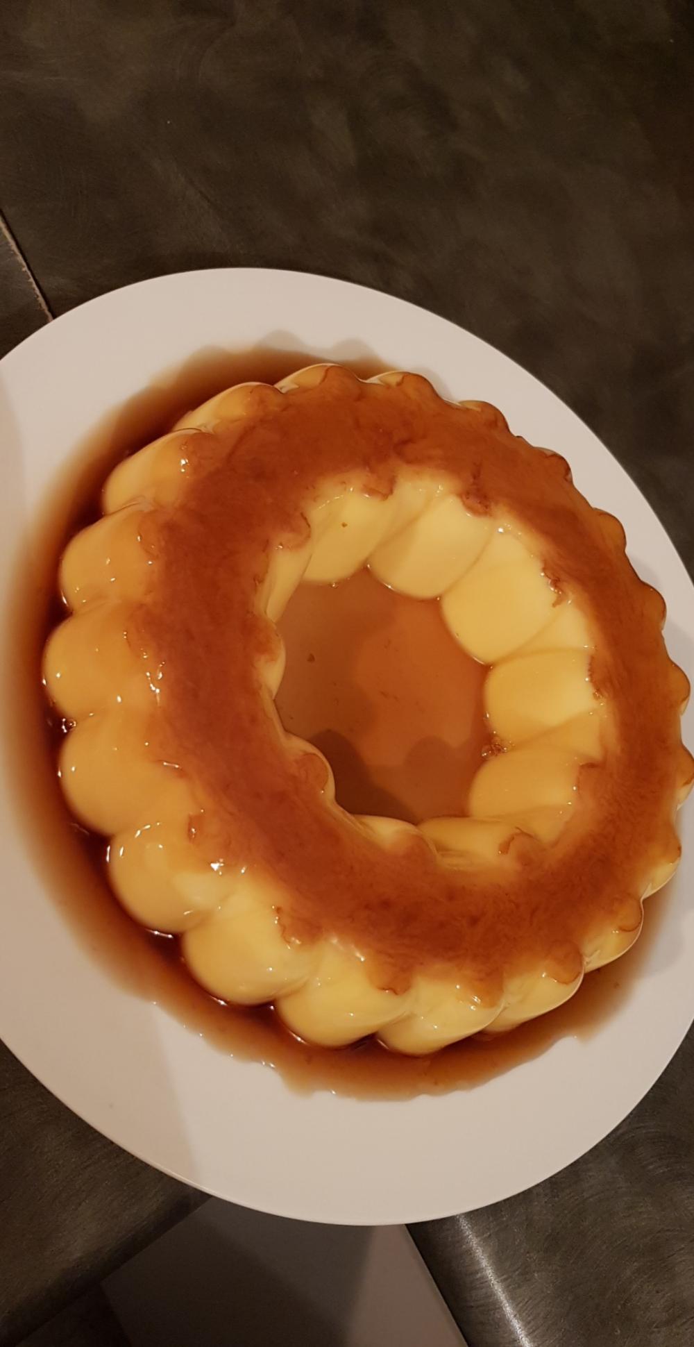 اولا لازم نعمل الكراميل نضع السكر في اناء ونضعه على النار ونتركه حتى يبلش يدوب ونصير نقلبه حتى يذوب جيدا ويصبح كالعسل ذهبي بس نتبهو ما يحترق بدك ياه ذهبي متل العسل نشيله عن النار ونصبه في الصينيه او في قالب انا حطيتو بالقالب.