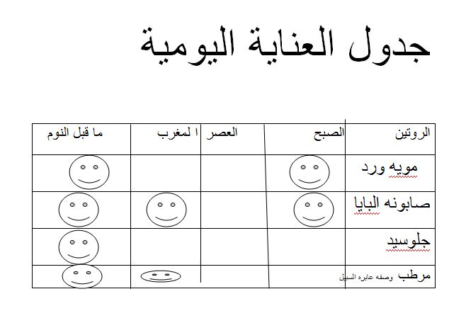 مرة في الاسبوع: نقعها في ماء حار مع ملح وديتول لمدة 30 دقيقة ،بعدها تفرك بأي صابونة ثم ملح الحليب ونستخدم حجر الأقدام ثم تمسح باسكينول ثم فازلين وجوارب .