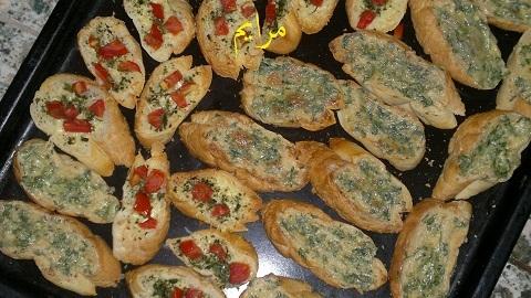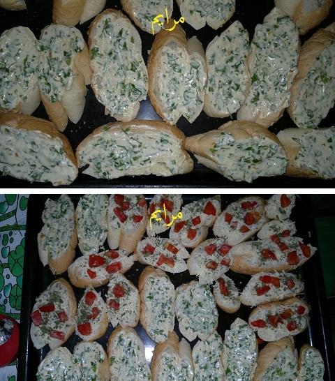امسحي الخلطة على قطع الخبزوانا شكلت قسم حطيت عليه جبن مبروش ونعناع مجفف وطماطم