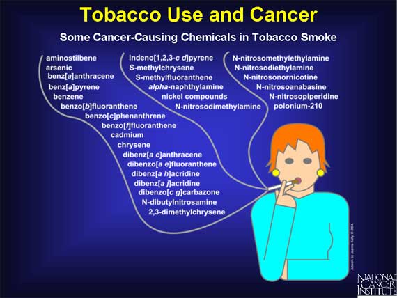 هو أحد أهم الأسباب المسببة للسرطان وهو المسبب الرئيس لـ 90% من سرطانات الرئة أيضاً له علاقة بسرطانات أخرى مثل سرطان المثانة ، سرطان المريء وسرطان الحنجرة و تزداد نسبة الإصابة بسرطان الرئة مع زيادة عدد السجائر فمن يدخن 25 سيجاره في اليوم تزداد نسبة إصابته بالسرطان إلى 25-30 مرة مقارنة بغير المدخنين. من المشجع أن توقف المدخن عن التدخين قبل فوات الأوان يقلل خطر الإصابة بسرطان الرئة تدريجياً حتى يصل بعد عدد من سنوات التوقف إلى نسبة مقاربة لمن هم لم يدخنوا من قبل.