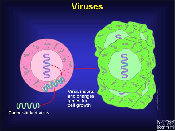 مثل الفايروسات او الباكتيريا حيث تتسبب في خلل في الخليه حتى تتحول الى خليه سرطانيه. من الأمثله على الفايروسات human papilloma virus حيث يتسبب في سرطان عنق الرحم، وفايروس الكبد الوبائي B