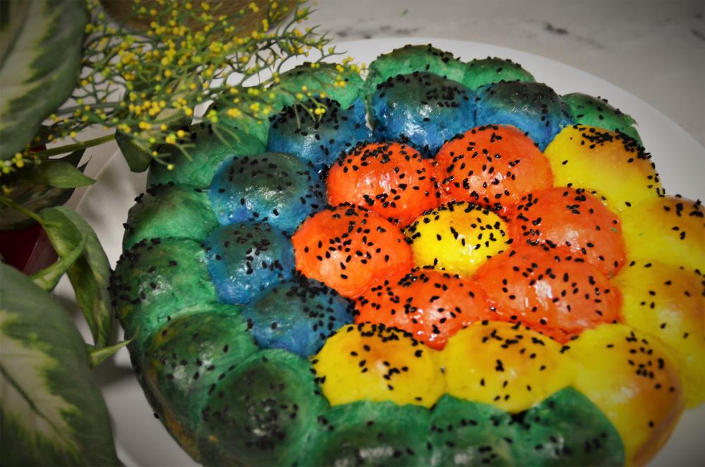 بالنسبة للخلية الملونة نقوم بتقسيم العجين الى اجزاء على حسب عدد الالوان المستخدمة ونخلط كل جزء باللون المطلوب ونغطي الوعاء ونضعه في مكان دافىء حتى يتخمر ويتضاعف حجمه وبعد ذلك نبدأ في الحشو نقوم باحضار صينية مناسبة وندهنها بالزيت وناخذ من العجين كور في حجم الليمونة الصغيرة ونضع بكل كورة قطعة جبنة مثلثات او جبنة كريمة حسب ذوقك ونبدأ نرتب الكور بالصينية من المنتصف الى الخارج حتى انتهاء الكمية وندهن الوجه بالبيض المخفوق واخر شيء ننثر حبة سوداء عالوجه وندخل الصينية الفرن على درجة مية وثمانين حتى ترتفع وتنضج من اسفل ثم نشغل الفرن من الاعلى ليحمر الوجه
