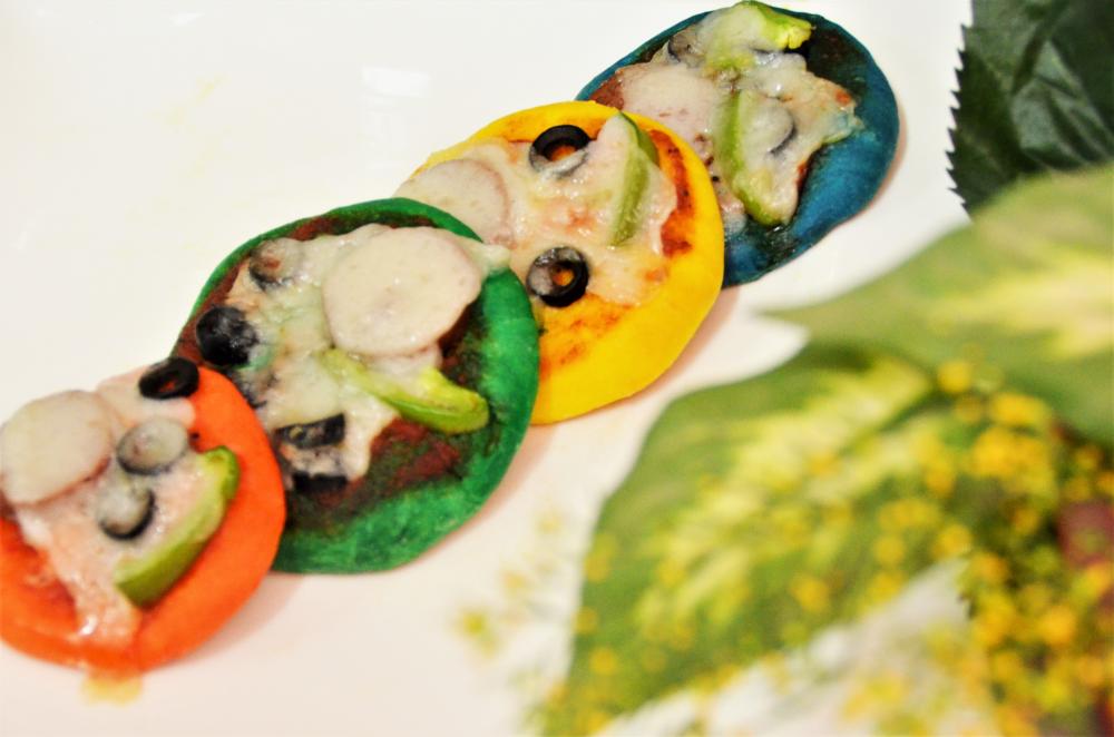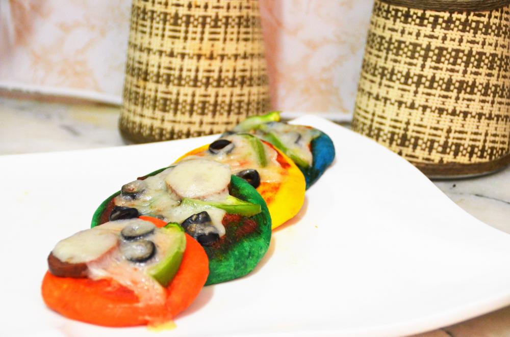 باقي العجين تقدري تعملي به ميني بيتزا ايضا وتقدميها لاطفالك راح يحبوها كثير من جمال الوانها الملفتة