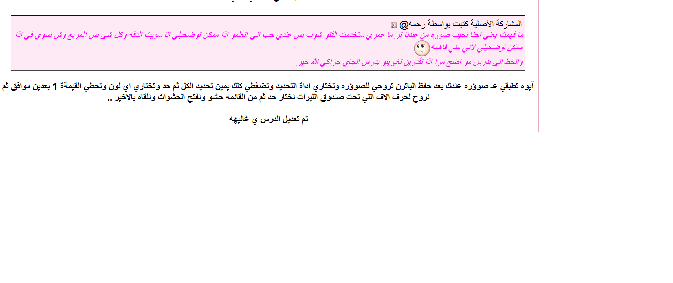 تابعت معك الدرس واتقنت الحمدلله وتسلم يدك يالغاليه بس الشي الي انتي كاتبتيه للاخت رحمه لم يتمم شررحه بما اننا جدد على الفتوو مستحيل نعررفه البنات ماشاء الله عندهم خلفيه سابقه