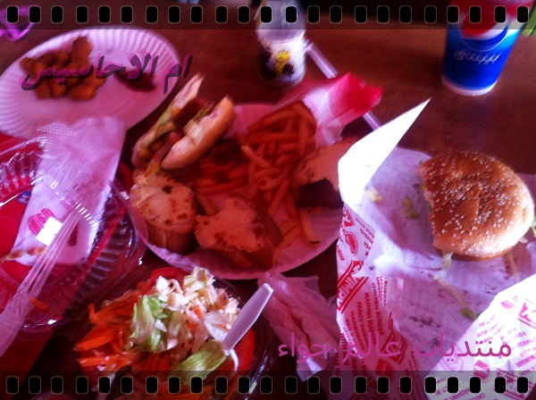 اكلنا طلبنا بيتزاوسلطة وناجيت وبرجر وخبز بالثوم ومشروب يبرد القلب