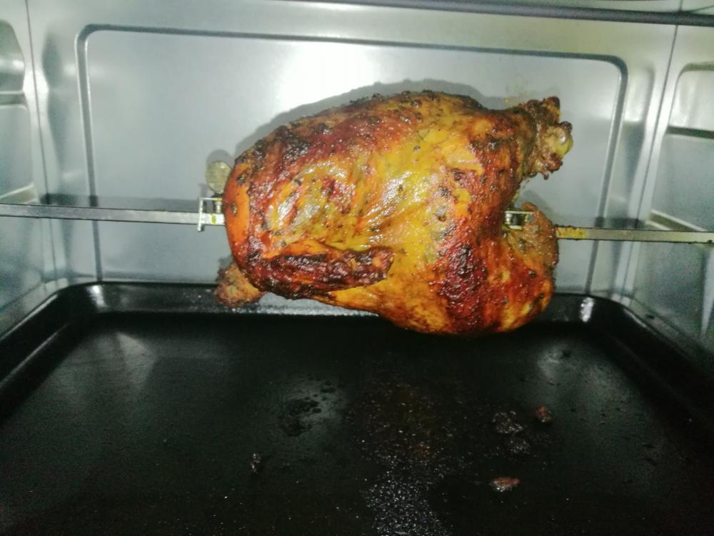 اليوم التالي طلعتها وحطيتها في قضيب الفرن وثبتها وحطيتها على درجة حرارة ٢٠٠ فوق وتحت وفتحت الفرن شوي كما هو موضح في الصورة بعد مرور ساعة بديت اسوي فيها ثقوب بالسيخ حق الشوي عشان تنزل منها الموية اخذت معي تقريبا ساعتين .