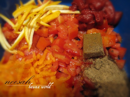 *قطعي الطماطم مكعبات وأطحني البهارات وأخلطيهم مع باقي المقادير.