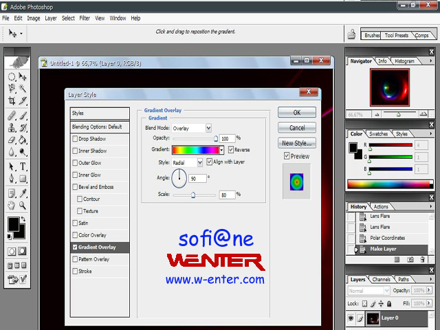 ثم نقوم باختيار gradient overly بالقيم التالية و تدرج لوني قوس قزح