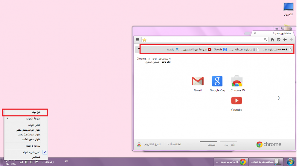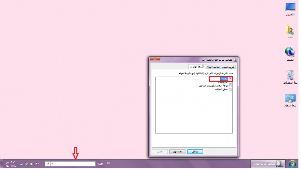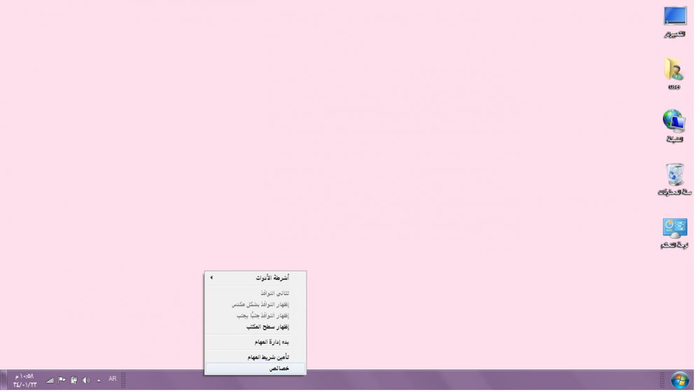 نحط الماوس على شريط المهام ونضغط بزر الفارة الايمن يظهر خصائص تضغط عليها